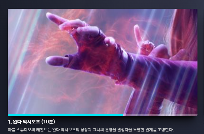 우선 마블탭의 디즈니 추천작중 레전드 란 항목을 처음 접하였는데 마블 장면중 가장 레전드 장면만 모음을 한것으로 보입니다. 마블 작품을 좋아하시는 분들이라면 보시면 바로 알수 있는 장면들이 많이 있습니다.